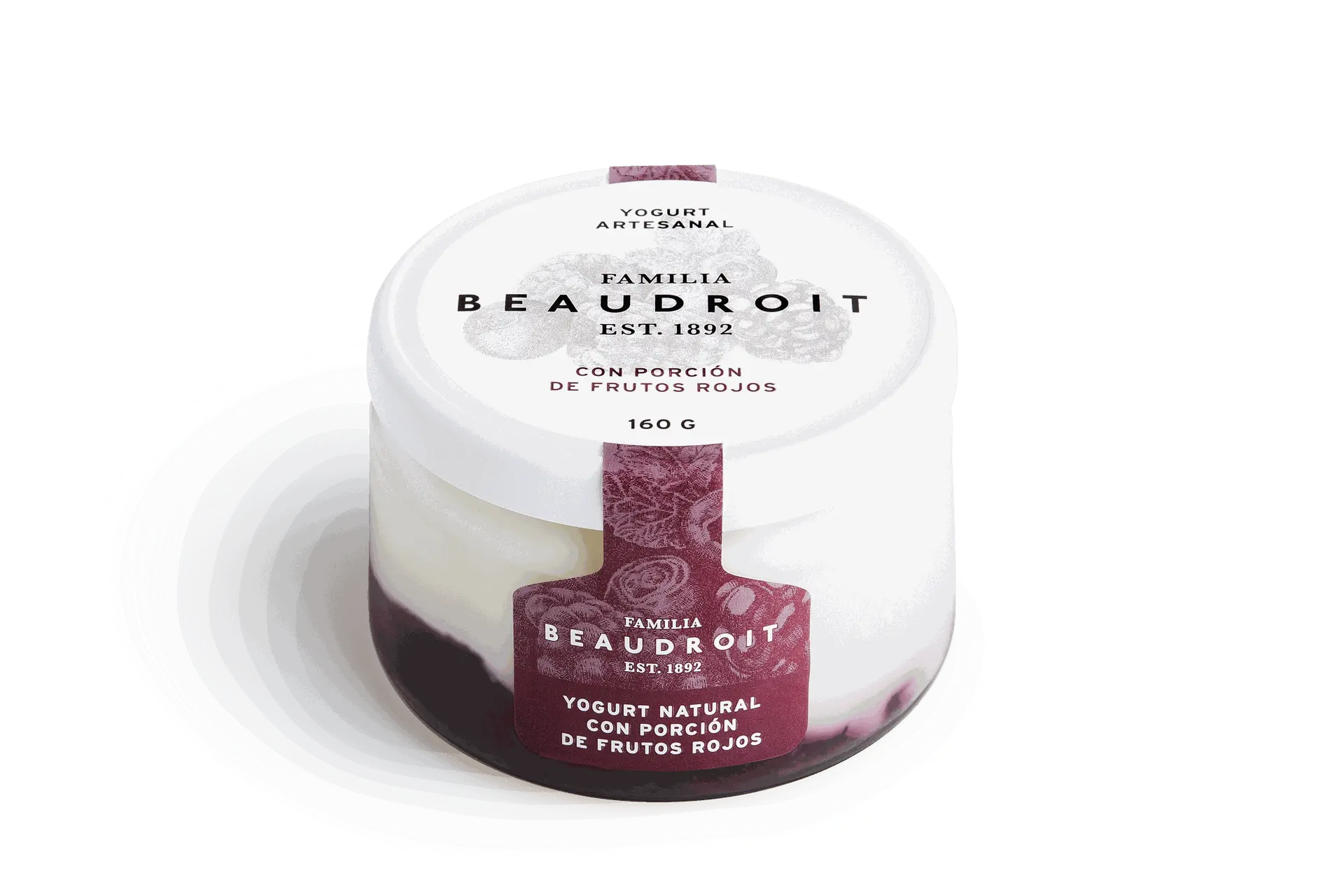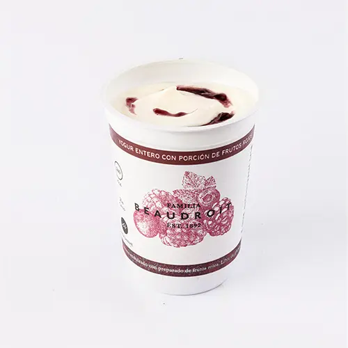 Yogur (87,5%): Leche entera pasteurizada, leche en polvo descremada, leche en polvo entera, azúcar, fermentos lácteos, estabilizante: pectina cítrica, preparado de frutos rojos (12,5%): frutos rojos, azúcar, carragenina, espesantes: almidón modificado y goma xántica, acidulante: acido citrico CONTIENE LECHE