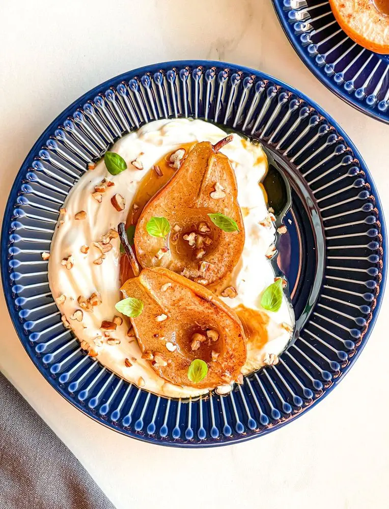 Cortar la pera en 2. pincelar con miel, la canela AOVE y llevar al horno al máximo por 15 minutos.