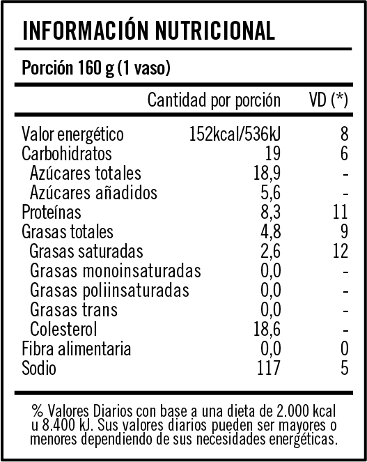 Ingredientes: Leche entera pasteurizada, leche en polvo descremada, leche en polvo entera, azúcar, fermentos lácteos, saborizante idéntico natural vainilla, estabilizante: pectina cítrica. CONTIENE LECHE